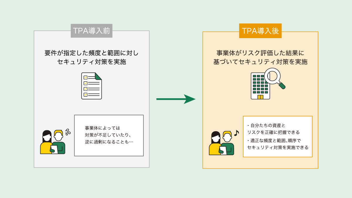 脅威の進化と運用環境の変化に伴い、全ての事業体に一律に適用されるセキュリティ対策の適用頻度はもはや有効ではなくなり、TRAにより事業体固有の属性に基づいたリスク評価、優先順位付け、セキュリティ対策の調整が必要になります。