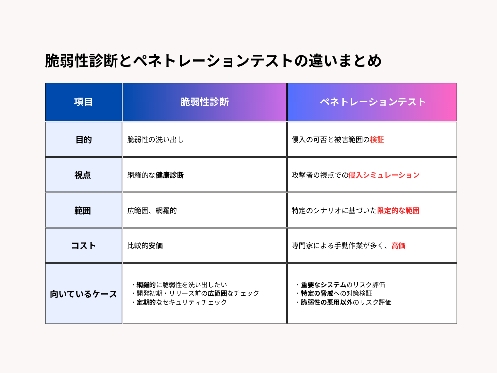 多くの場合、まずは脆弱性診断で基本的なセキュリティレベルを確保し、その上で必要に応じてペネトレーションテストを実施するという流れがおすすめです。