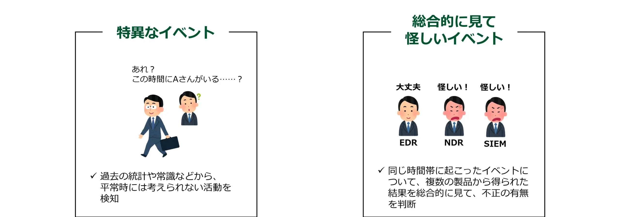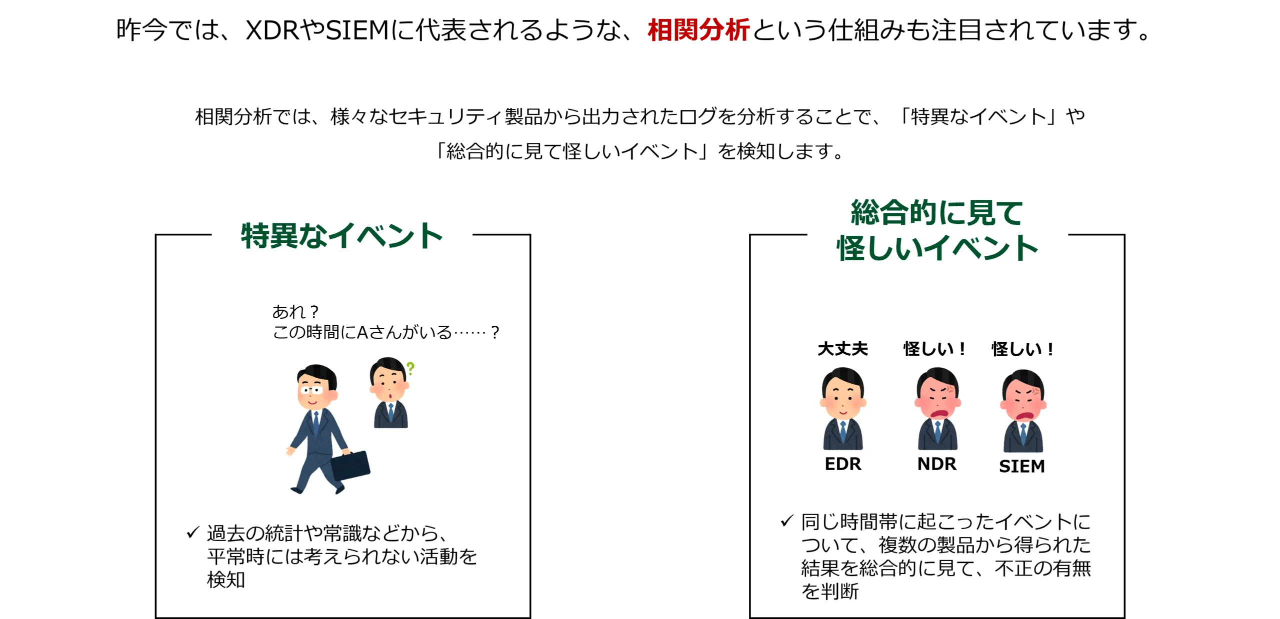 相関分析では、様々なセキュリティ製品から出力されたログを分析することで、「特異なイベント」や「総合的に見て怪しいイベント」を検知します。
