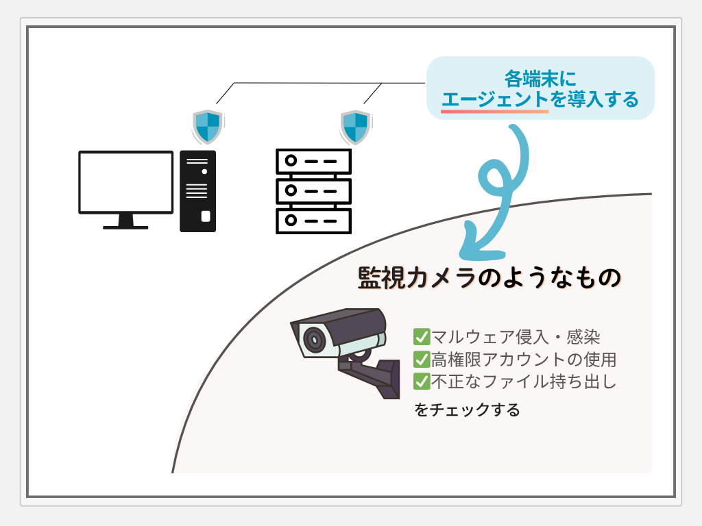 EDR(Endpoint Detection and Response)は、業務端末やサーバーなどの機器にエージェントを導入し、マルウェア感染や内部不正などの不審な動きを監視・記録するセキュリティ製品です。