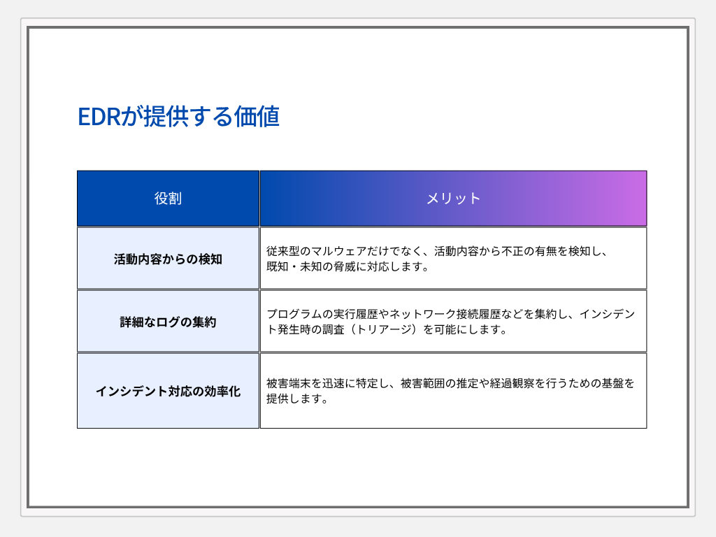 EDRは、インシデント発生時の対応時間を大幅に短縮する、現代のセキュリティ運用に不可欠なツールです。