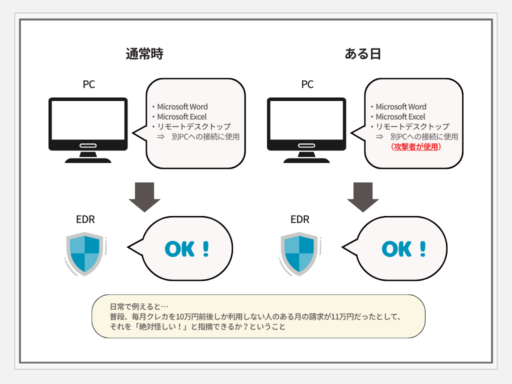 EDRはマルウェアのような「あからさまに怪しいプログラム」の実行は検知できますが、LotL攻撃で使われるツールは普段から業務で利用されている「正常なプログラム」です。