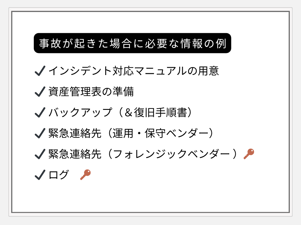上記の中で、特にフォレンジックとログの準備が、インシデント後の生存戦略を左右する鍵となります。