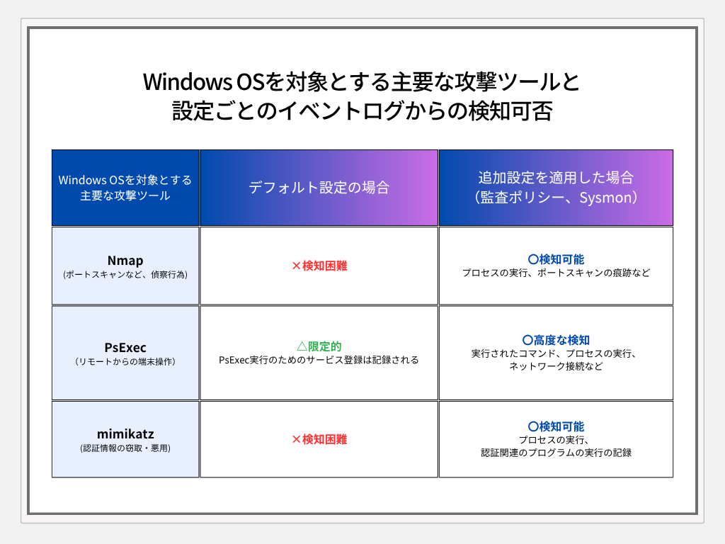 デフォルトでは、攻撃者が利用する「プログラムの実行履歴」や「設定変更の履歴」など、フォレンジック調査に重要なログが取得されていないことが多いです。