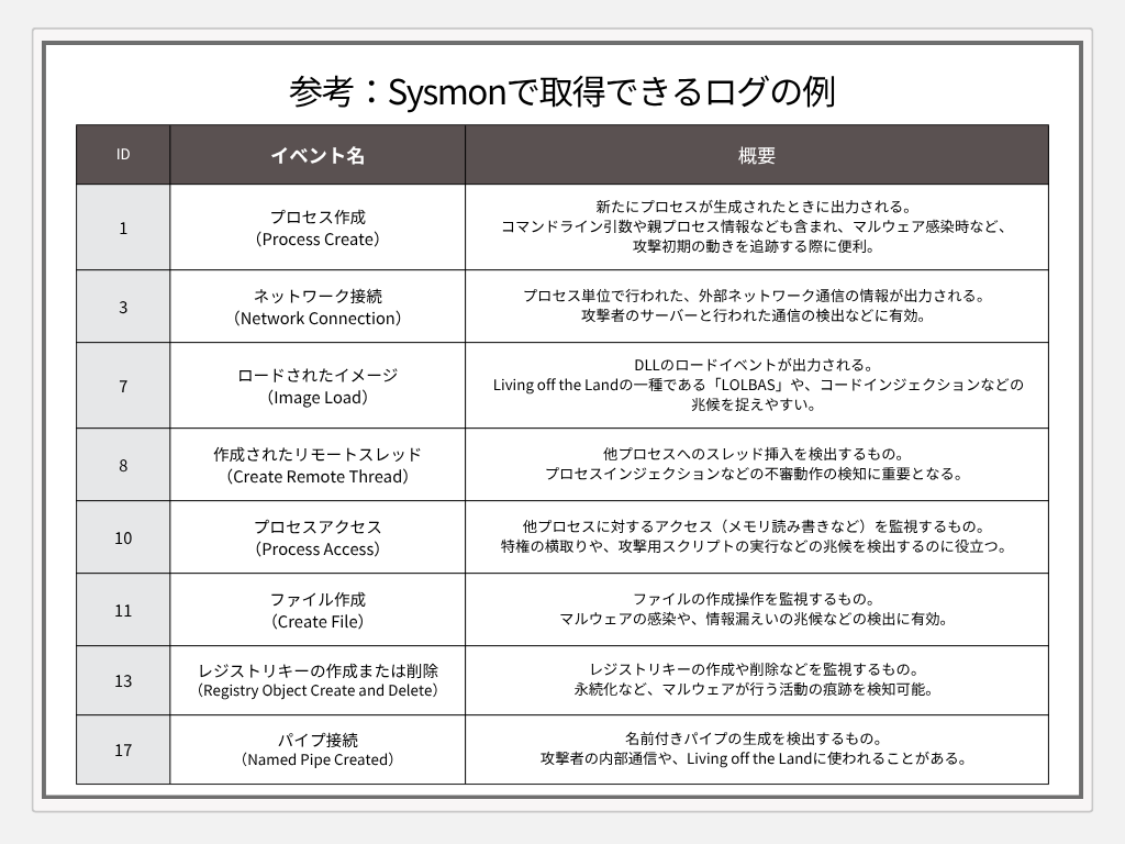 Microsoft社から無料で提供されているSysmon(System Monitor)は、導入することで非常に詳細なログを簡単に取得できるようになるツールです。