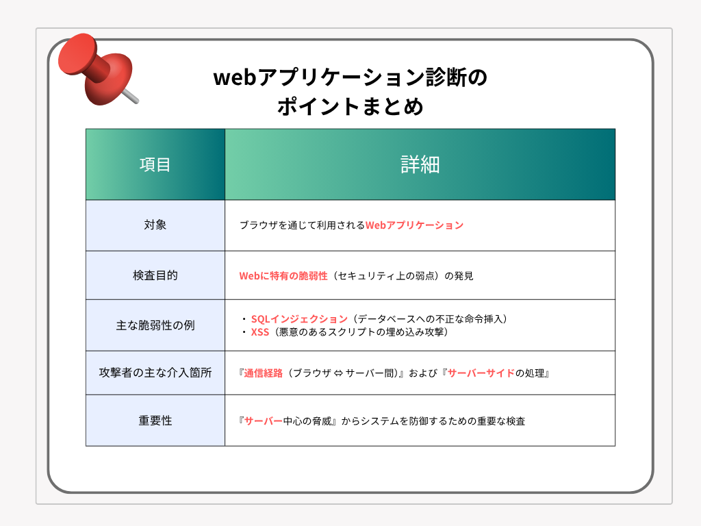 Webアプリケーション診断は、これらのサーバー中心の脅威からシステムを守るための重要な検査なんです。