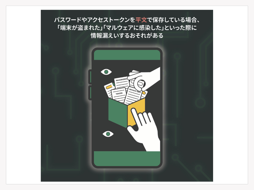 万が一、パスワードやアクセストークン(ログイン状態を維持するための「鍵」のような情報)を平文(暗号化されていない、誰でも読める状態)で保存していた場合、端末が盗まれたりマルウェアに感染したりした際に、利用者のアカウント情報や機密情報が漏えいするおそれがあります。
