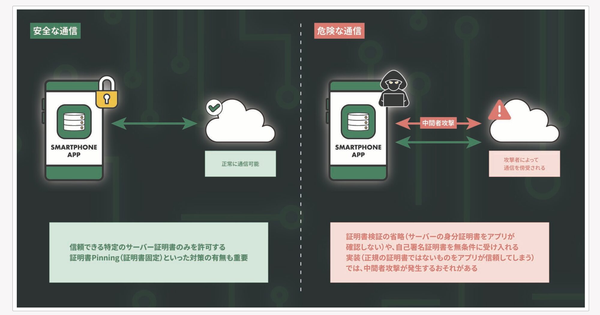 スマホアプリでは、Webブラウザが自動的に行うようなブラウザのセキュリティ機構(通信の安全性を確保する仕組み)が利用できないため、通信の安全性はアプリの実装(アプリのプログラムの作り方)に依存します。