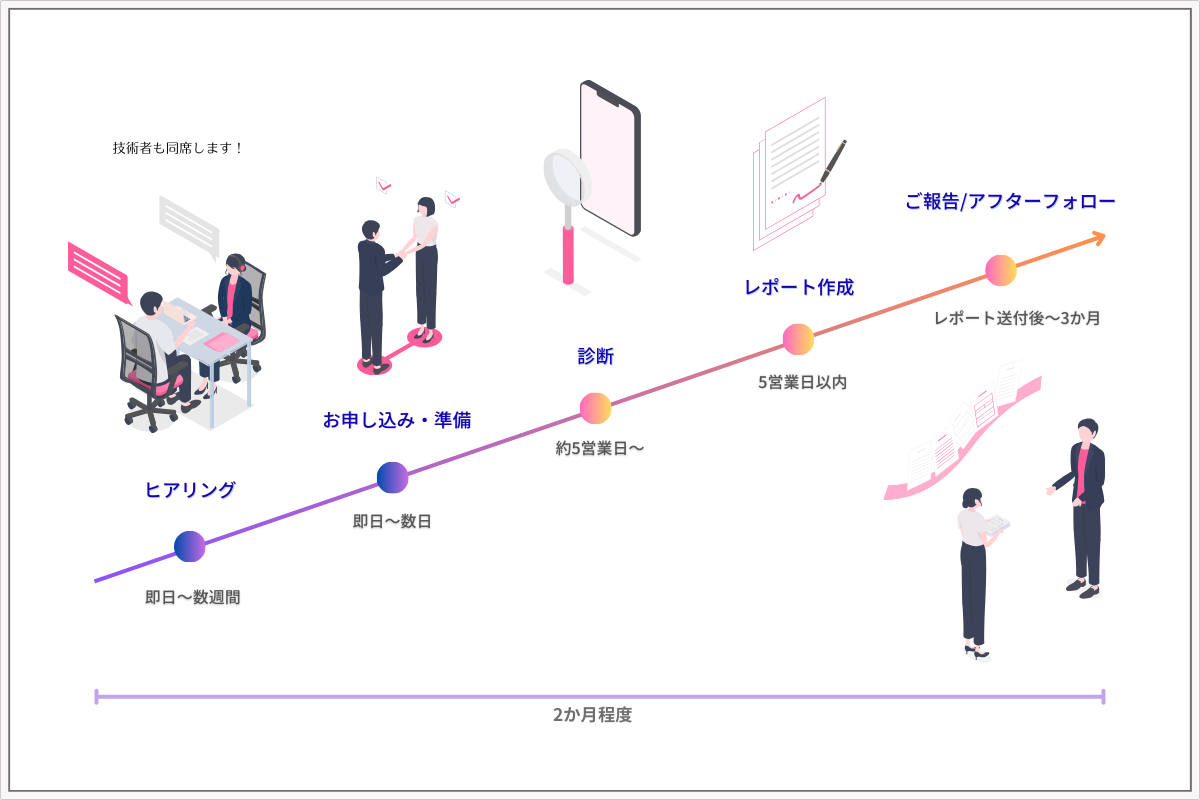 「自社のアプリにはどの診断が必要?」「リリースまで時間がない!」といった場合も、まずはWeb会議にて技術的な観点からアドバイスさせていただきます。