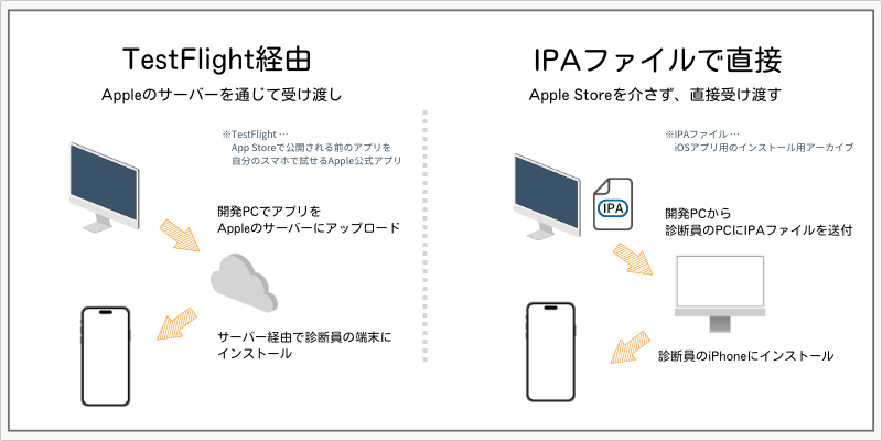 診断対象のアプリの受け渡しは、TestFlight経由で弊社所有の端末にインストールする形や、IPAファイルをご提供いただく形で進めていきます。
