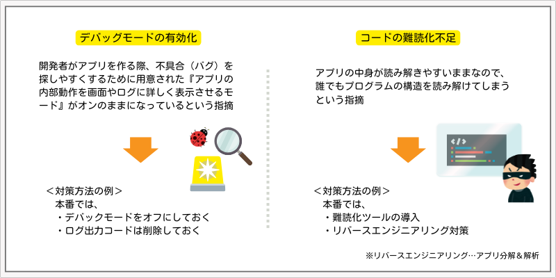 アプリが解析されやすい状態だったため、可読性のある関数名一覧を提示し、リバースエンジニアリング対策の必要性を報告しました。