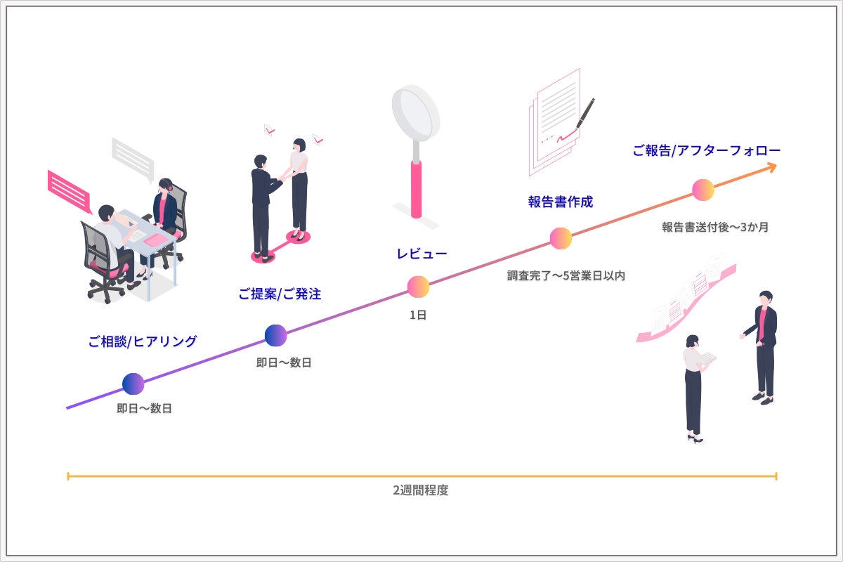 調査端末は『お客様でご用意いただいた端末を利用する方法』と、『弊社側で用意した端末を利用する方法』の2パターンがあります。端末をご用意いただく場合には、事前に調査用のツールを導入いただく場合があります。