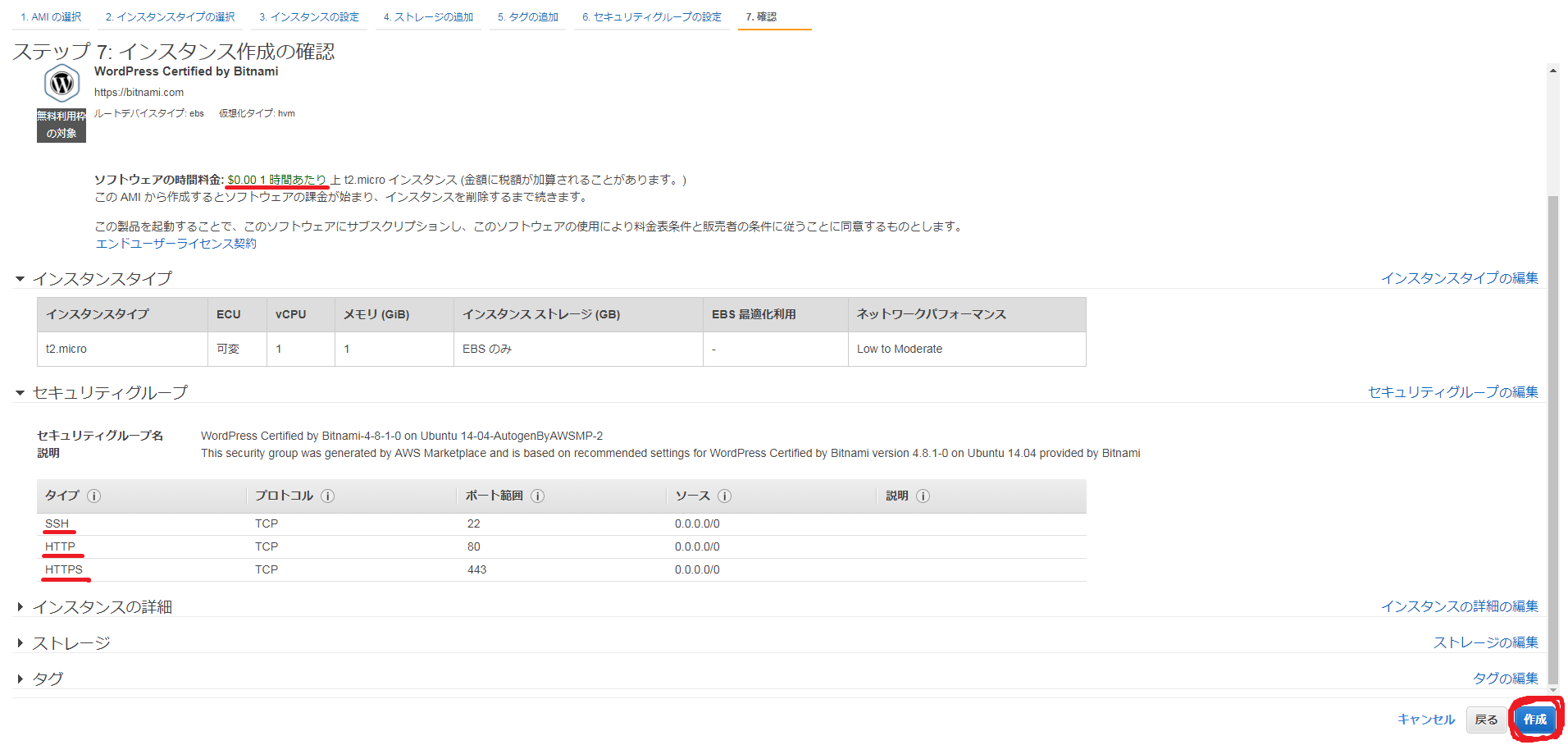時間料金がちゃんと無料になってることと、SSHとHTTPとHTTPSのポートがちゃんとあいているのを確認して「作成」。