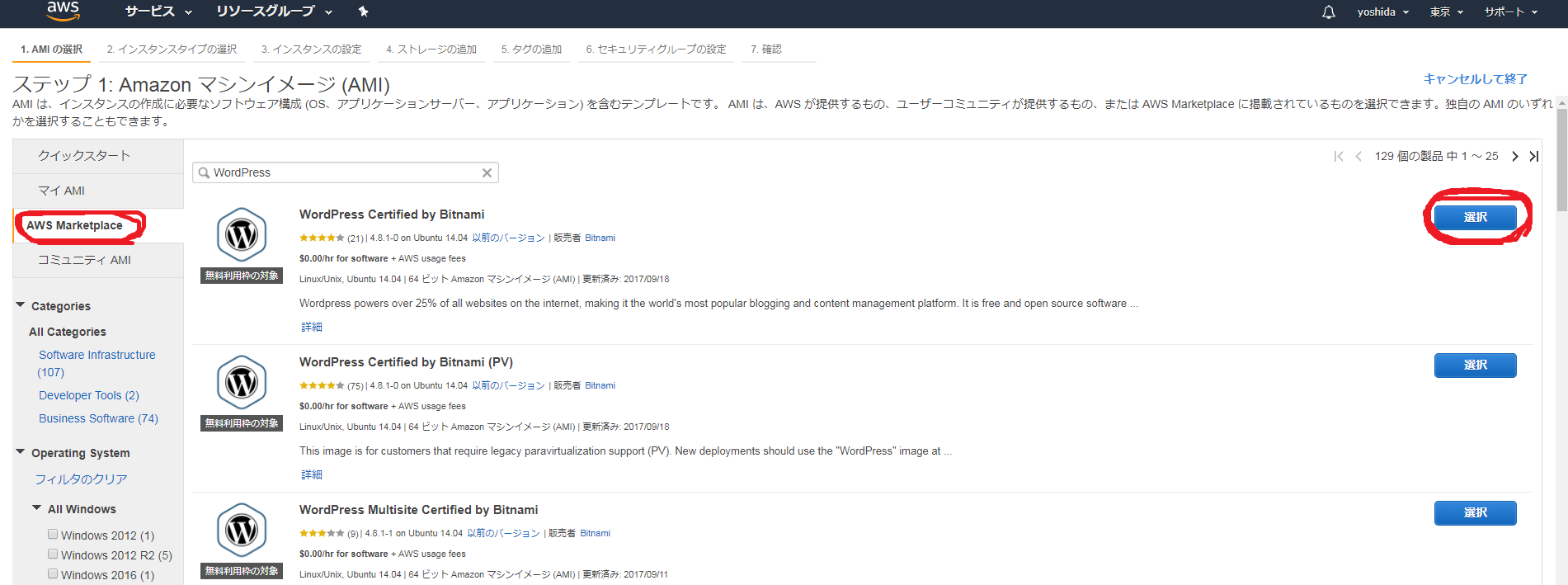 AMIの選択ページにきます。「AWS Marketplace」で「WordPress」と検索して、今回は無料利用枠の対象であるWordPress Certified by Bitnamiを「選択」。