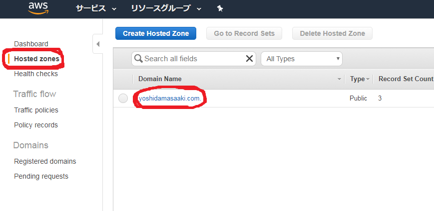 Route 53 コンソールの 「Hosted Zones」 部分を開き、⑤で作成したドメイン名をクリックします。