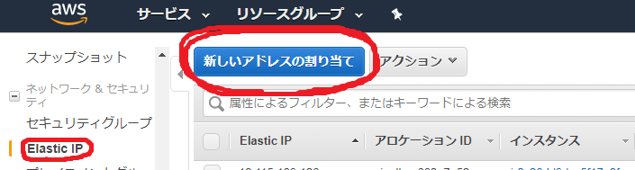 右上のリージョンが「東京」になっているのを確認し、左のサイドバーの「ネットワーク&セキュリティ」から「Elastic IP」を選択して、「新しいアドレスの割り当て」をクリック。