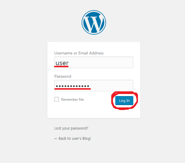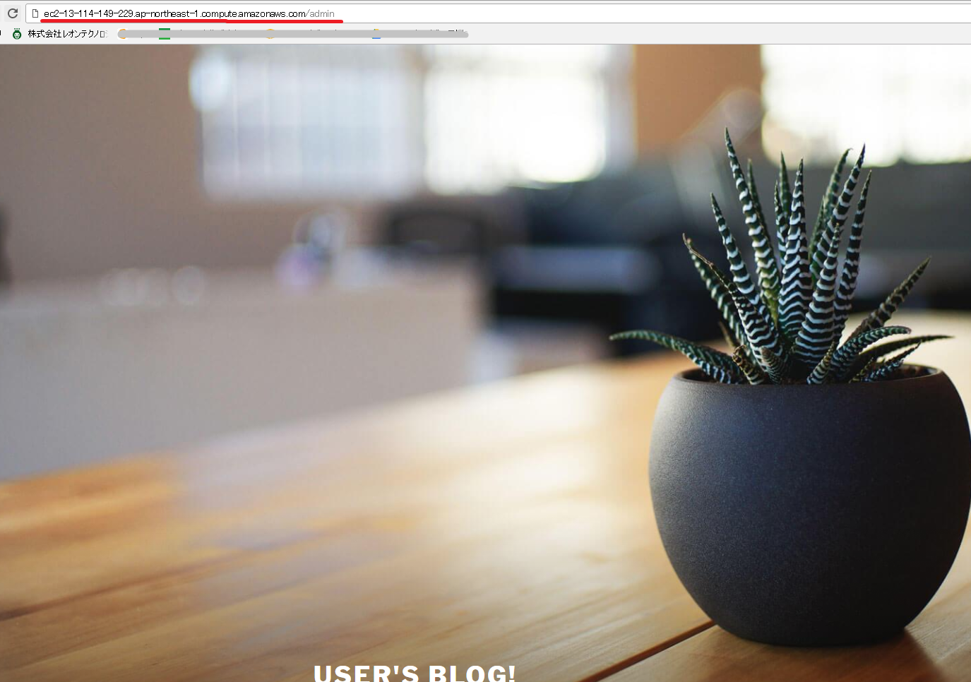 さきほど表示させた自分のWordPressのサイトへ移動します。URLの後ろに/adminを追加すると、管理者ログイン画面に移動します。(僕の場合はhttp://ec2-13-114-149-229.ap-northeast-1.compute.amazonaws.com/admin)