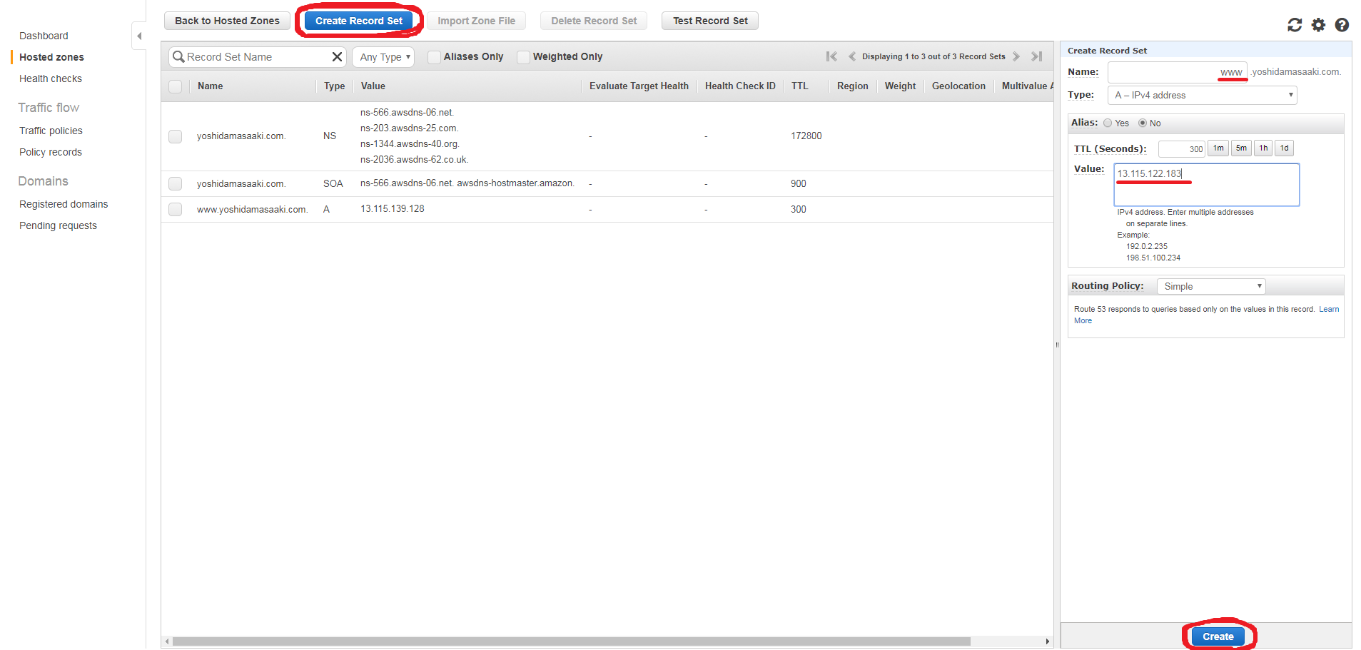 ④で作成した Elastic IP アドレス(僕の場合は13.115.122.183)をValueボックスに入力してから、「Create」をクリックします。