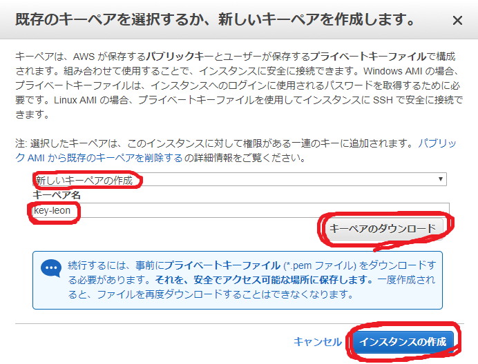 管理者がサーバーの操作などする時に必要な秘密鍵を作成します。そのキーペアの作成画面で「新しいキーペアの作成」を選択し、キーペア名を入力(なんでもいいです)。