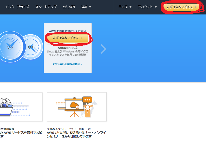 https://aws.amazon.com/jp/←AWSの公式ページです。右上の「まずは無料で始める」をクリックしてください。