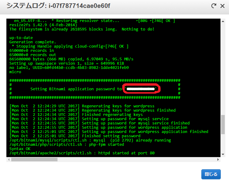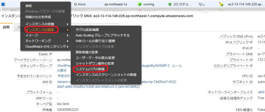 たちあげたインスタンスを右クリックし、「インスタンスの設定」から「システムログの取得」を選択。