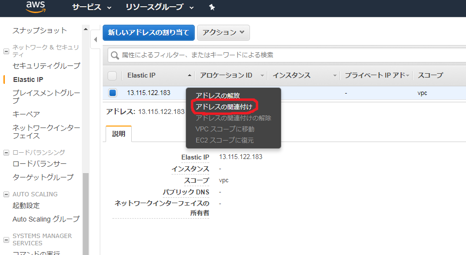 表示されたIPアドレスを右クリックして「アドレスの関連付け」を選択。