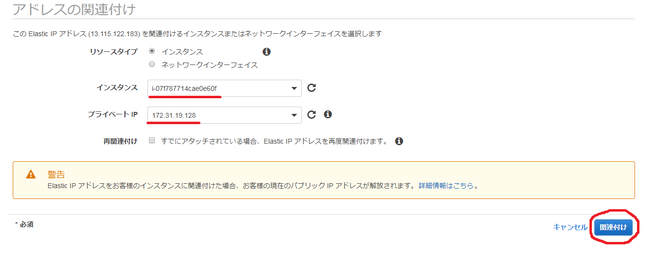 リソースタイプはインスタンス、インスタンスに②でたちあげたサーバーを選択。プライベートIPを選択し、「関連付け」をクリック。