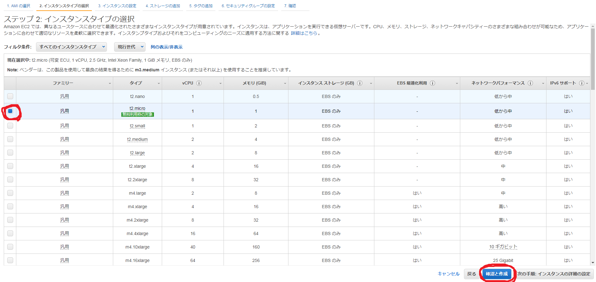 インスタンスタイプの選択では、無料利用枠の対象である「t2.micro」というタイプを選択して、「確認と作成」へ。