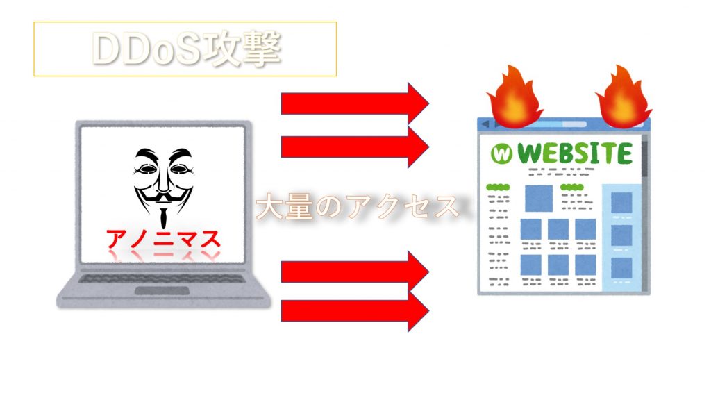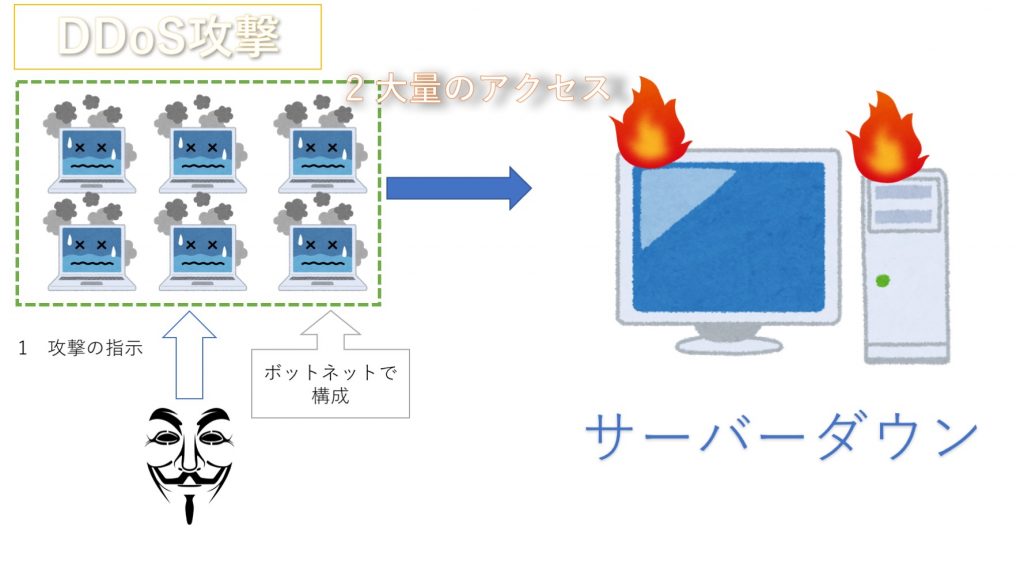 DDoS攻撃(Distibuted Denial-of-Service) 直訳すると、分散型サービス拒否アタックといいます。