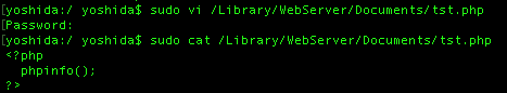 ただ、何も設定していない状態で/Library/WebServer/Documents/tst.phpを設置しても、もちろん表示されません。どうするかというと、今回はPHPを動かしたいのでhttpd.confの以下の記述のコメントアウト(#)をはずしてください。