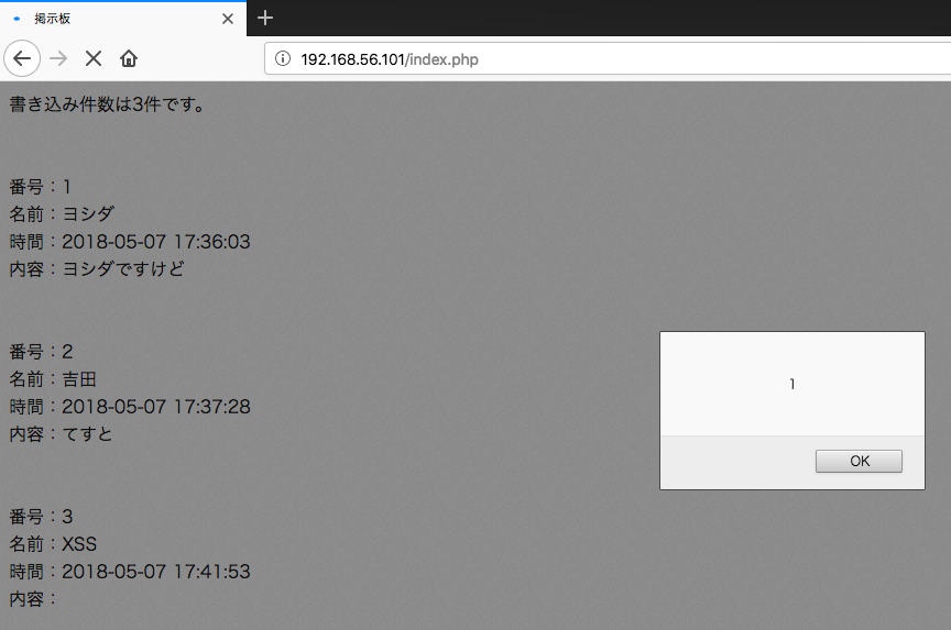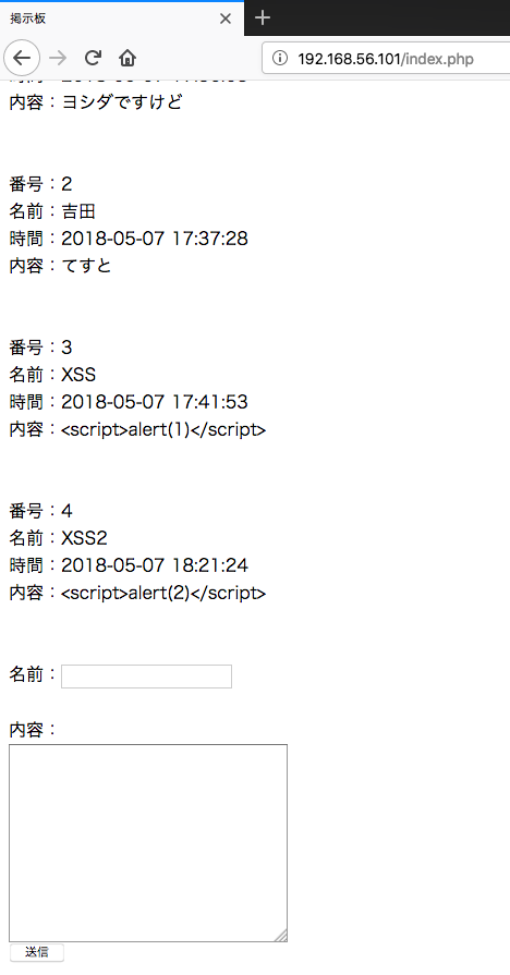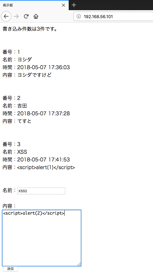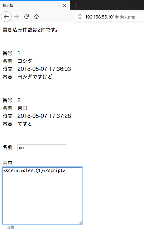 入力フォームにスクリプトをいれて確認ページに移動してみると、発生しちゃったりね。
